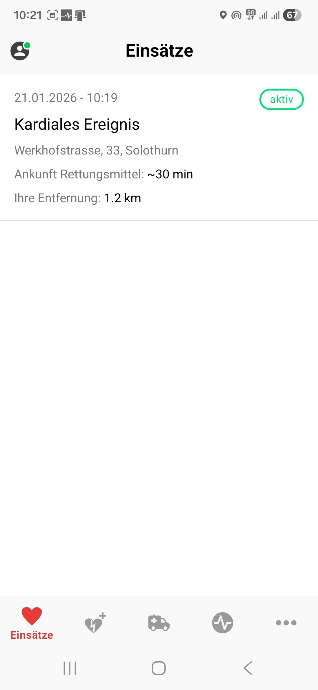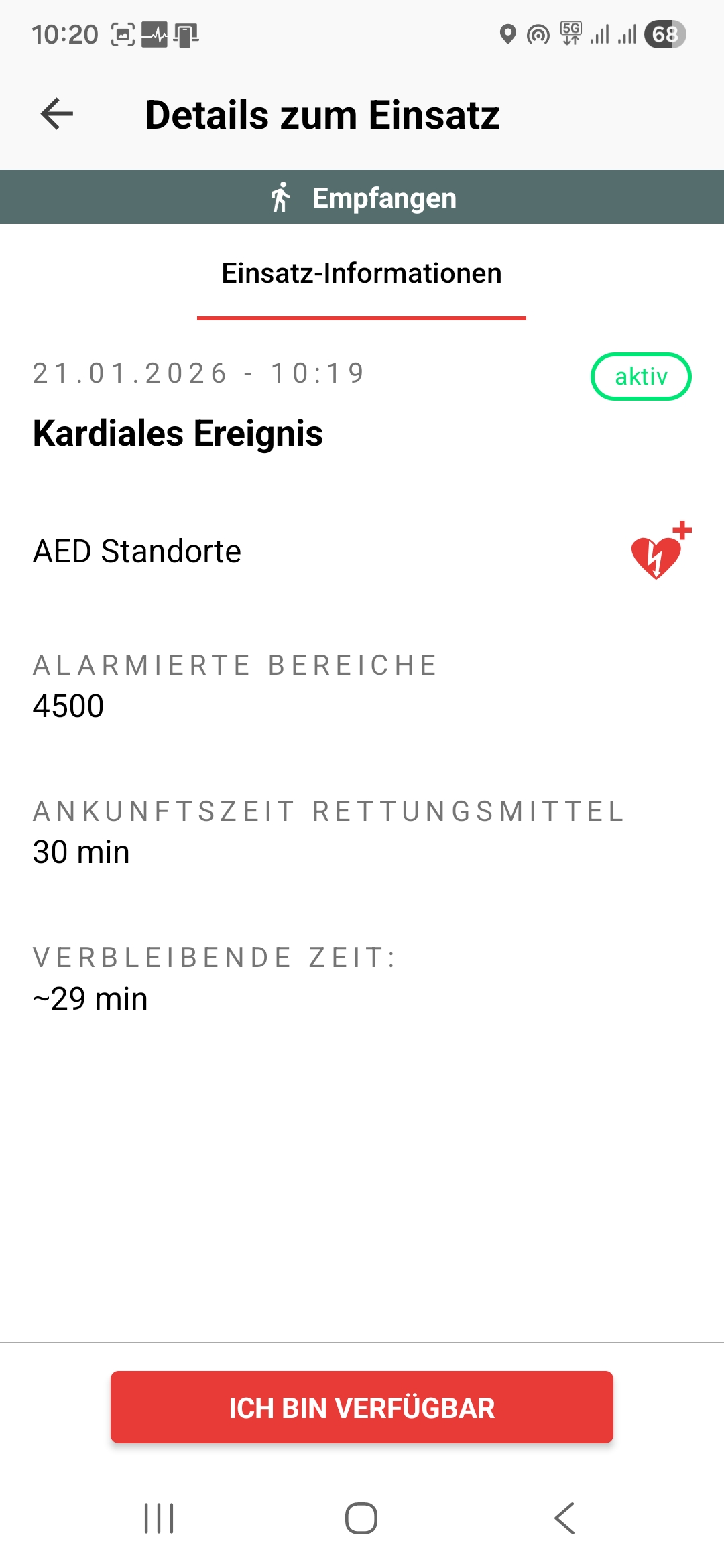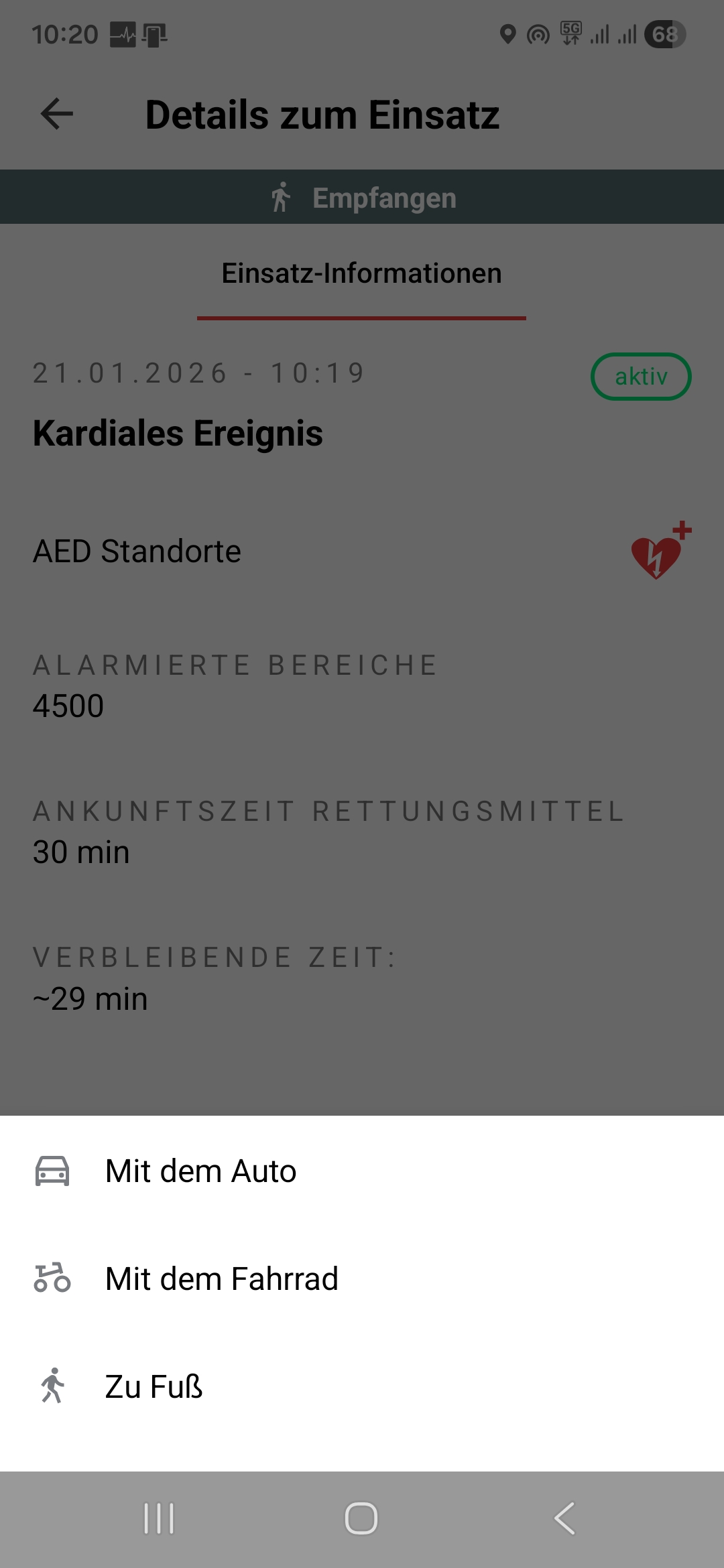 Unter der Karte in der Einsatzübersicht erscheint zudem neu ein Button, mit welchem man sich die zum Einsatzort nächstgelegenen AED anzeigen lassen kann. Auch hier können die Standorte in die Navigation einbezogen werden.