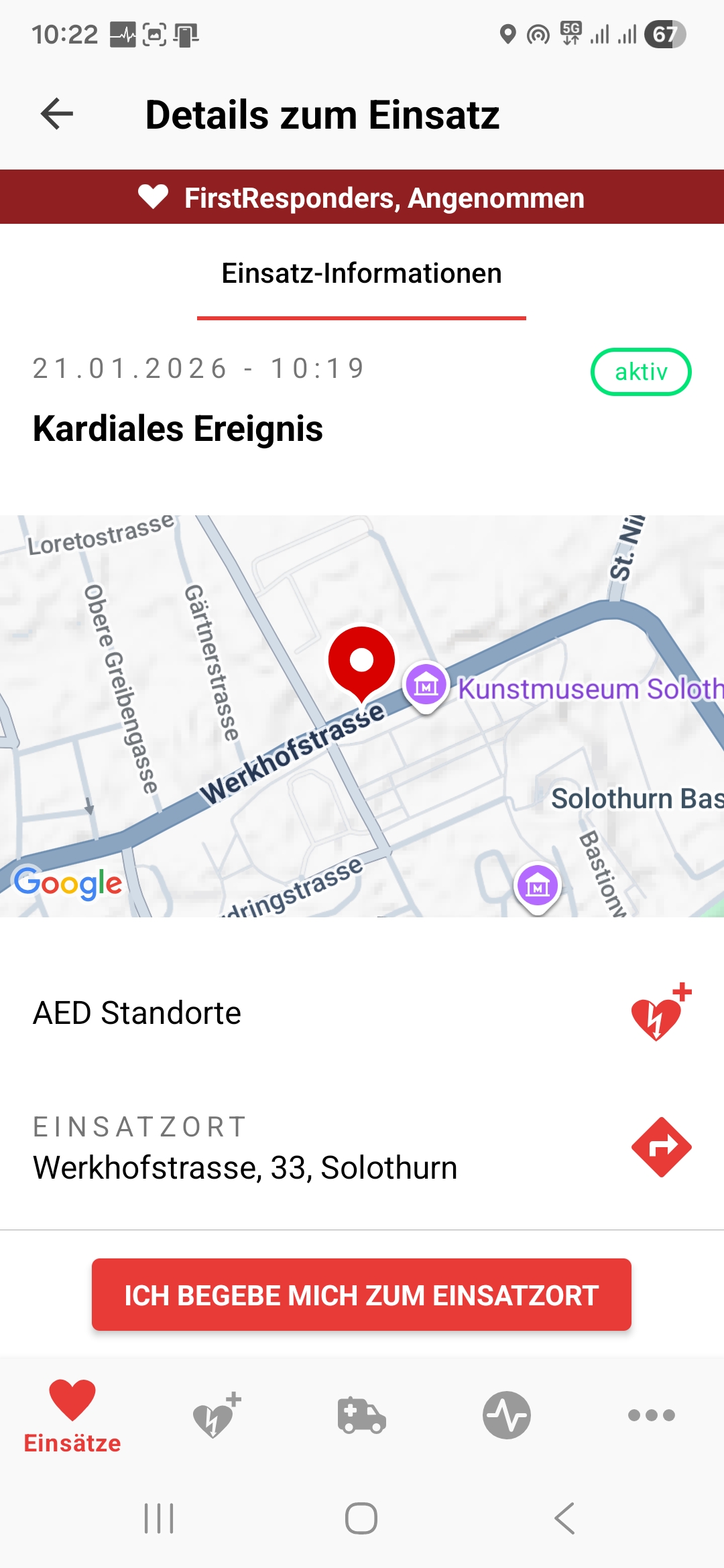 Wichtig ist weiterhin, dass ich beim Ausrücken den Button "ich begebe mich zum Einsatzort" drückt. Nur so ist für die Alarmzentrale ersichtlich ob jemand ausgerückt ist und um wen es sich dabei handelt. Dies ist relevant, falls euch die Alarmzentrale während des Ereignisses kontaktieren muss.